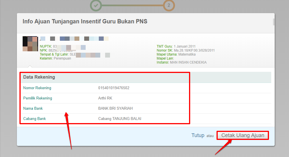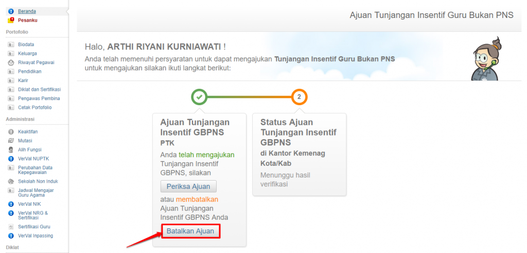 Sedangkan untuk memperbaiki data ajuan, silakan batalkan dahulu ajuan Anda (selama belum disetujui oleh admin Kemenag Kota/Kab), pada laman Ajuan Tunjangan Insentif, klik tombol Batalkan Ajuan dan ulangi ke-5 diatas dengan mengisikan data yang sesuai.
