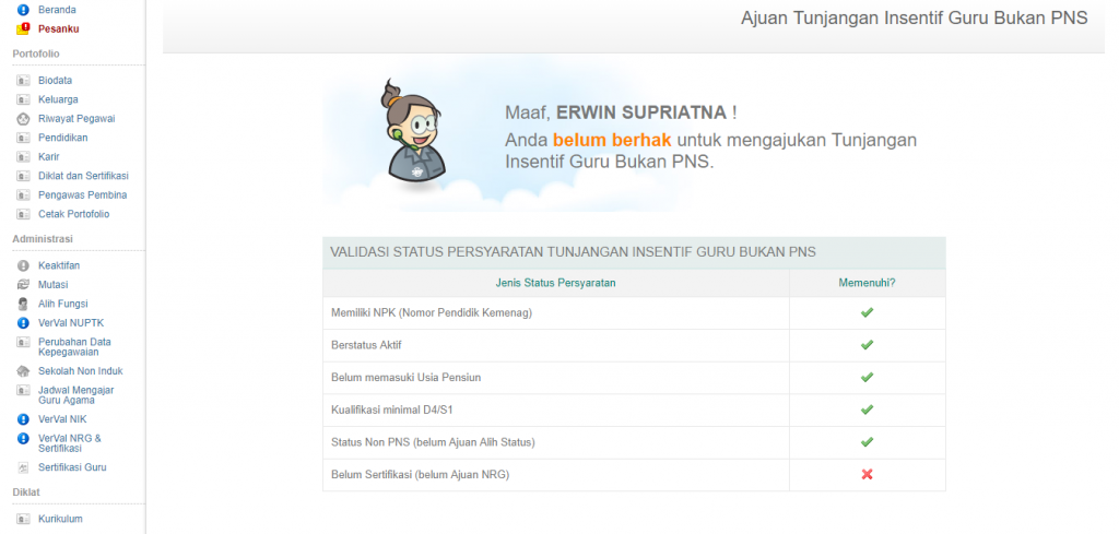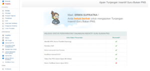 Bagi PTK bukan PNS yang belum memenui syarat ajuan intensif GBPNS, saat akses fitur Tunjangan Insentif GBPNS, sistem akan memberikan informasi syarat ajuan yang belum terpenuhi seperti pada gambar dibawah ini :