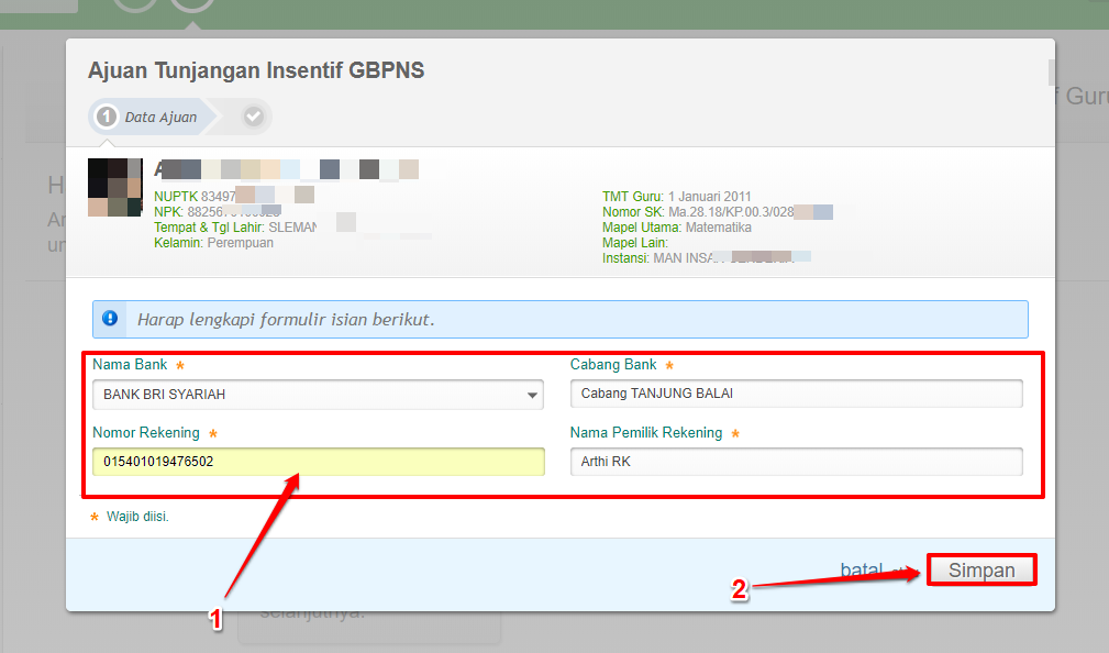 Pada kotak dialog, harap lengkapi formulir isian data rekening bank yang telah disediakan. Jika telah sesuai klik SIMPAN.