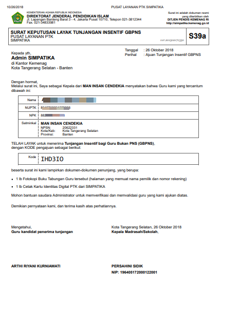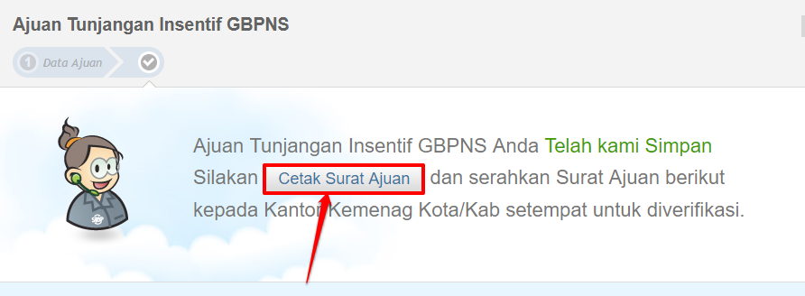 Ajuan Tunjangan Insentif GBPNS Anda Telah tersimpan, Silakan Cetak Surat Ajuan tersebut dan serahkan Surat Ajuan beserta lampiran dokumen pendukung kepada Kantor Kemenag Kota/Kab setempat untuk diverifikasi. Berikut contoh hasil cetak surat ajuan tersebut.
