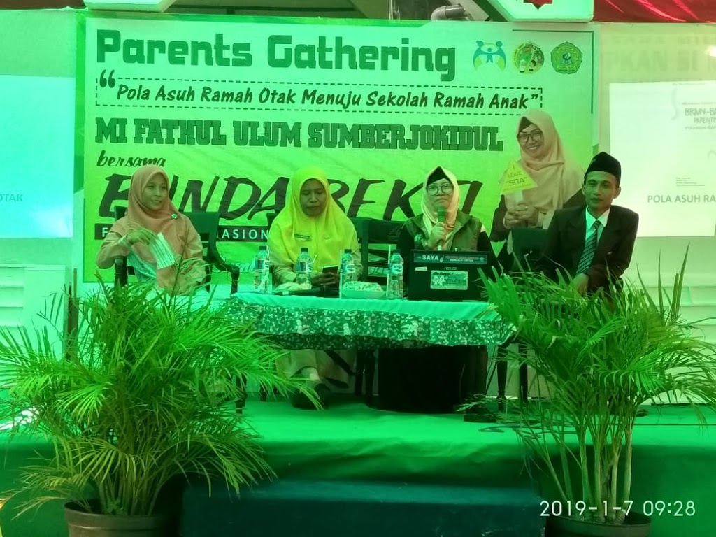 MIFUNEW — Senin (07/1/2019) bertempat di Halaman Madrasah Ibtidaiyah Fathul Ulum Sumberjokidul, Madrasah Ibtidaiyah Fathul Ulum Sumberjokidul mengadakan Parents Gathering. Parents Gathering ini mengangkat tema Pola Asuh Ramah Otak Menuju Sekolah Ramah Anakdengan menghadirkan pembicara Bunda Bekti Prastyani, S.Pd. selaku fasilitator Nasional Sekolah Ramah Anak